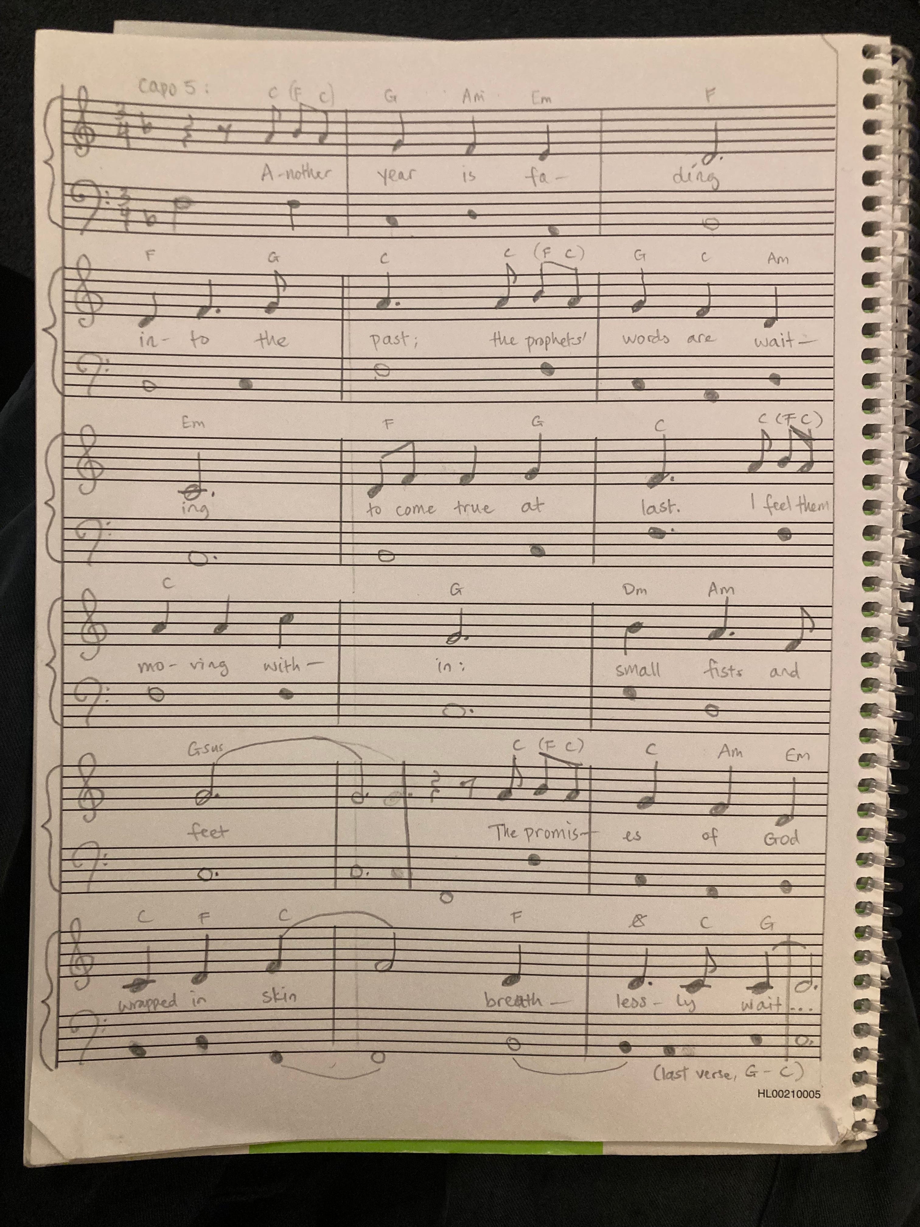 I have tried to facilitate instrumentation with my very meagre composition skills in the image below. There are a basic melody and bass harmony (which may not fit what is actually played in the recording) and guitar chords for a capo’d instrument (even better if you’re good enough to play in F major without a capo; I’m not, and originally played and sang this in the very low key of C). I took the dubious liberty of composing a song that ends each stanza on the dominant, then shifts to land on the tonic at the end. This creates the feeling for me of pressing forward into the next stanza—an impatience underlying the patience—and gives greater resolution to the end: “We shall be forever with you, Immanuel.”